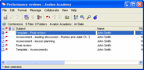 John creates templates as stationery documents in the Performance reviews conference to periodically post reviews of Al's work.