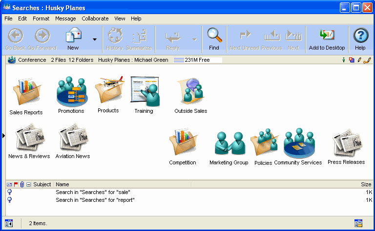 If Michael performs the same searches on these conferences regularly, he may want to consider saving them. They are saved in his Searches container, and he can run them at any time by double-clicking them.