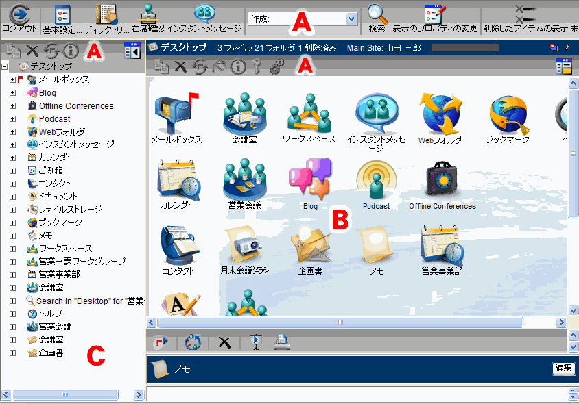 メインペインには、 開いているコンテナ(会議室、フォルダ、カレンダーなど、アイテムが保存されているFirstClassオブジェクト)やオブジェクト(メッセージなど)の内容が表示されます。
