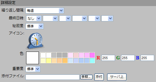 予定を色分け表示する場合に使用してください。例えば、会議の予定はすべて青い背景色にするといった設定が可能です。参加を依頼されたユーザは、受け取った予定のコピーの色を変更できます。